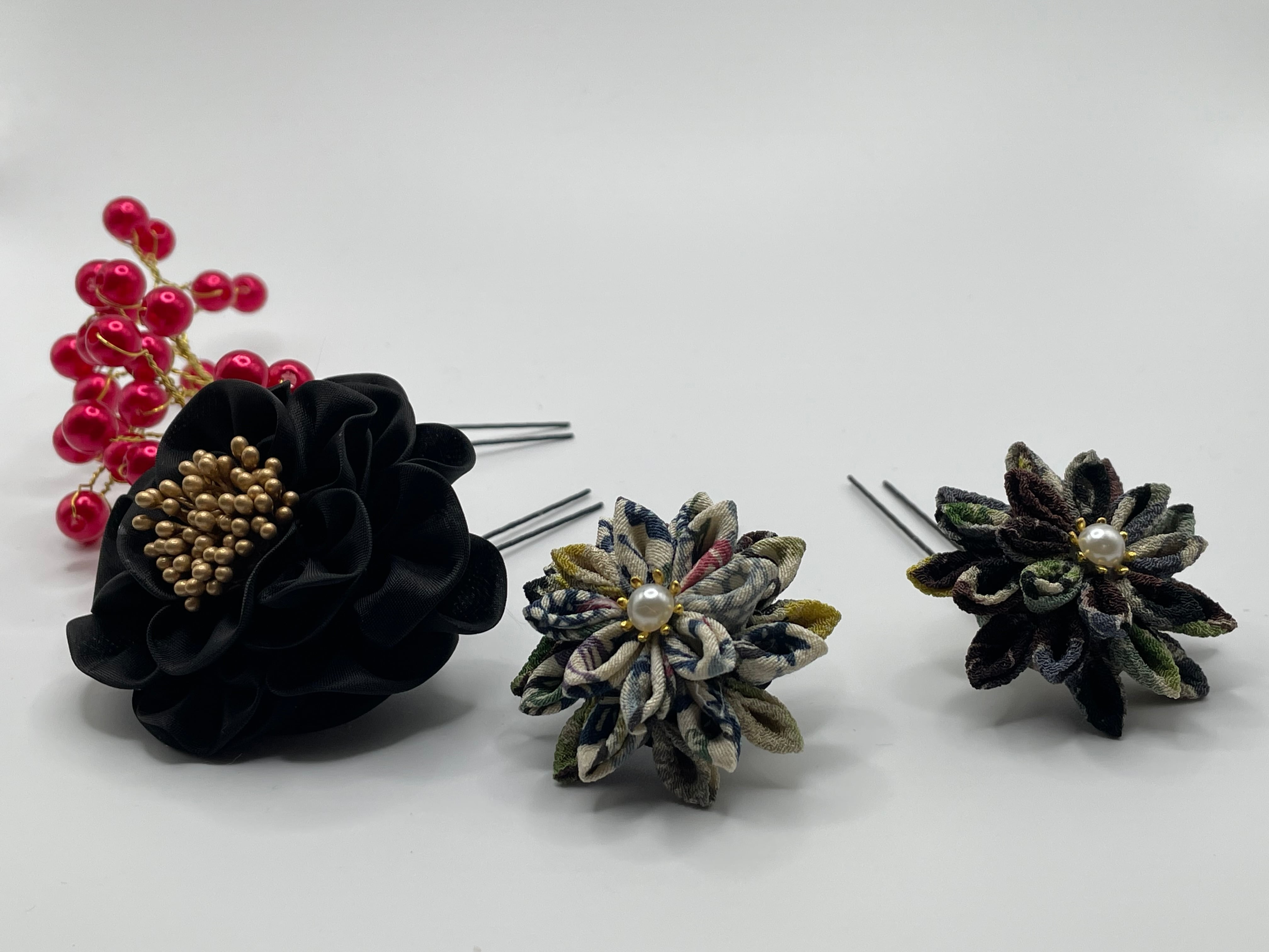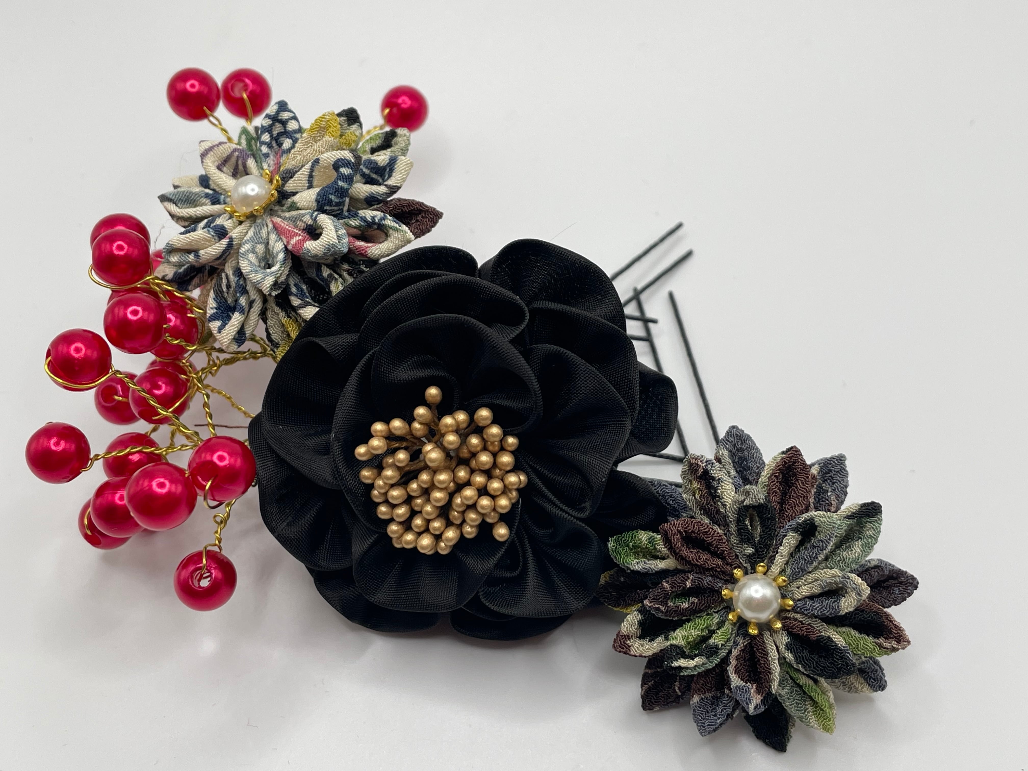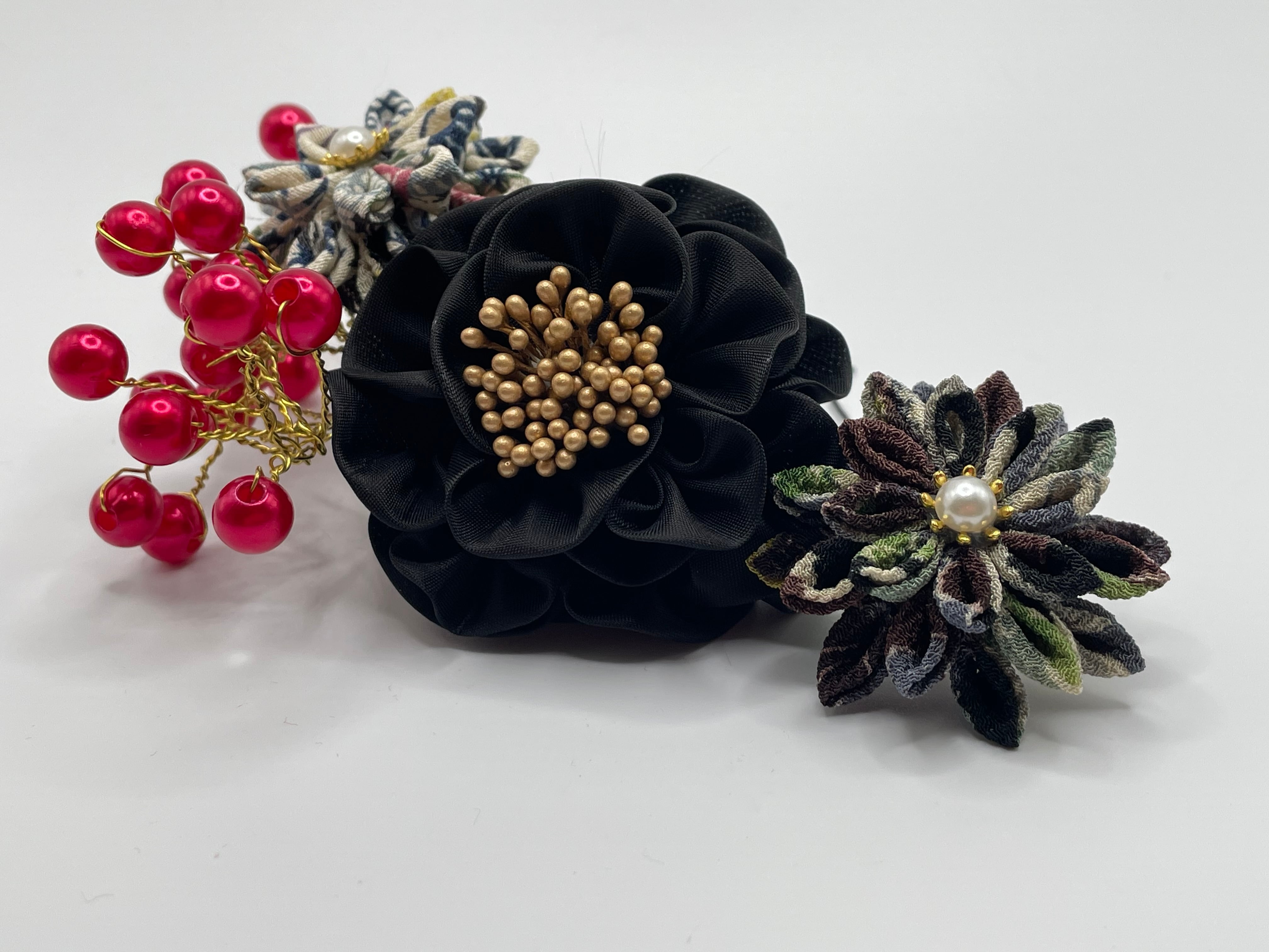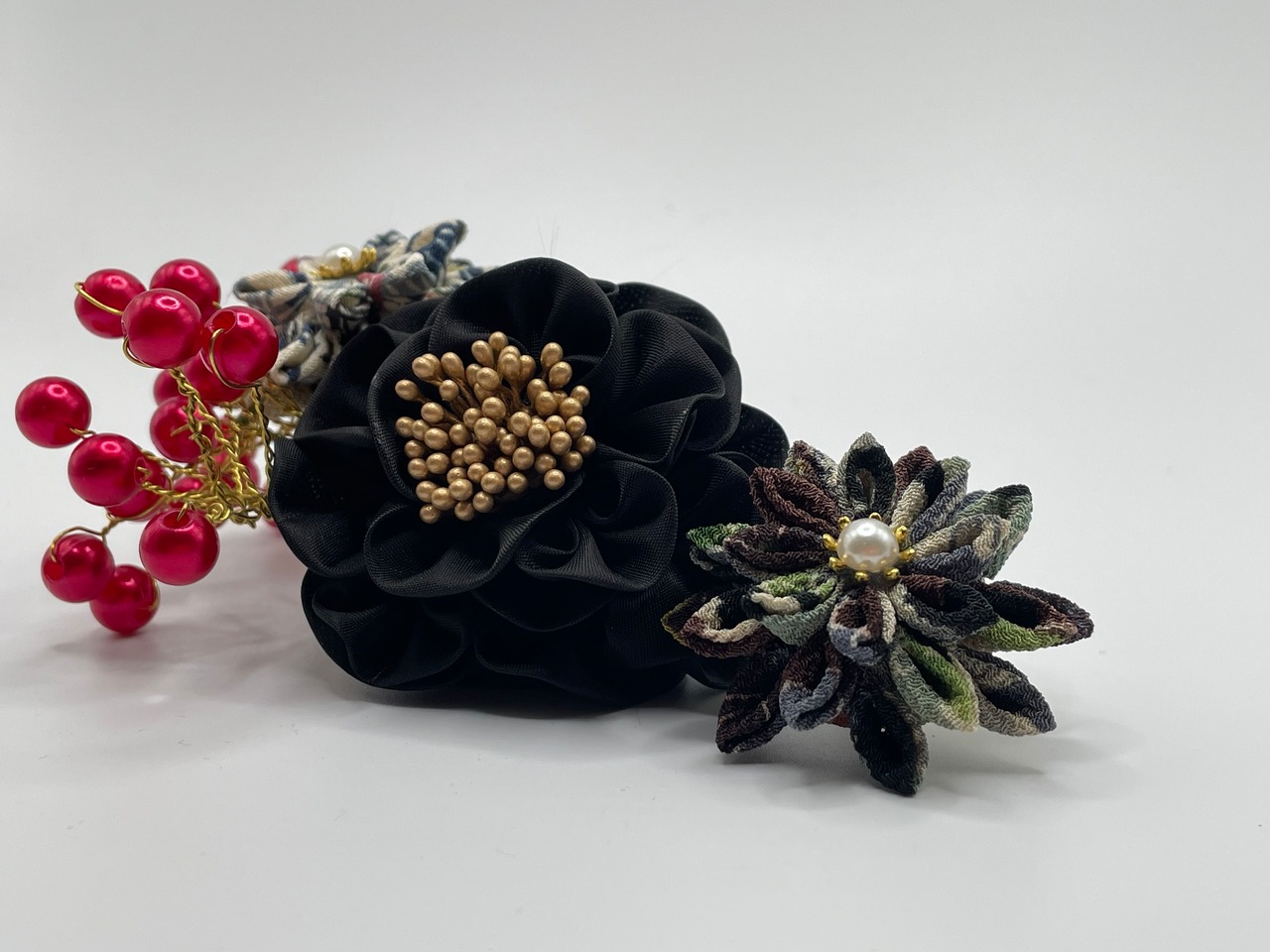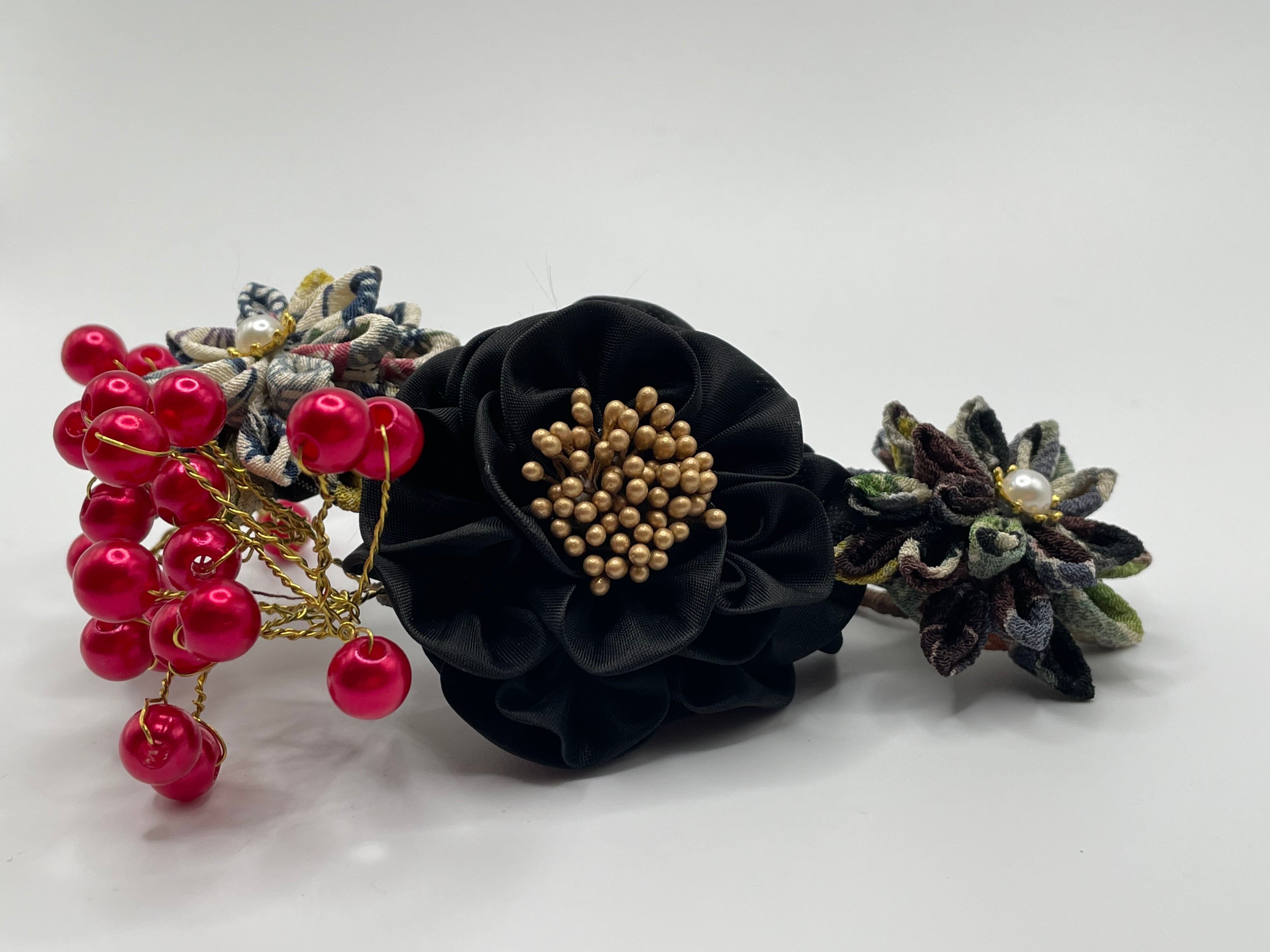 古典柄の一越ちりめんとブラックのキュプラレーヨン羽二重を使用して可愛らしさと上品さを兼ね備えた髪飾りを制作してみました。