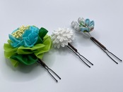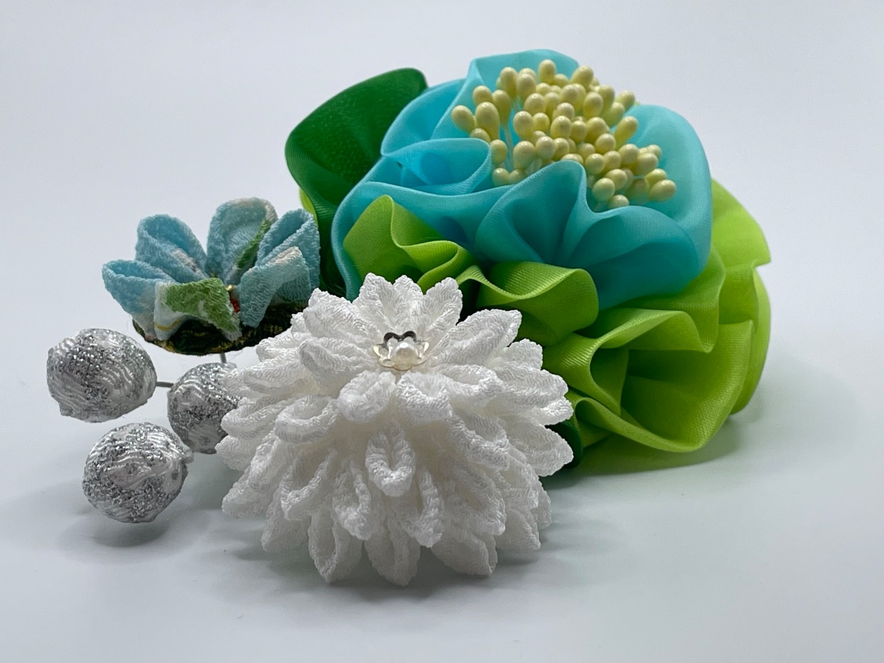 ホワイトの一越ちりめんとグリーン系のキュプラレーヨン羽二重を使用して色鮮やかな髪飾りを制作してみました。